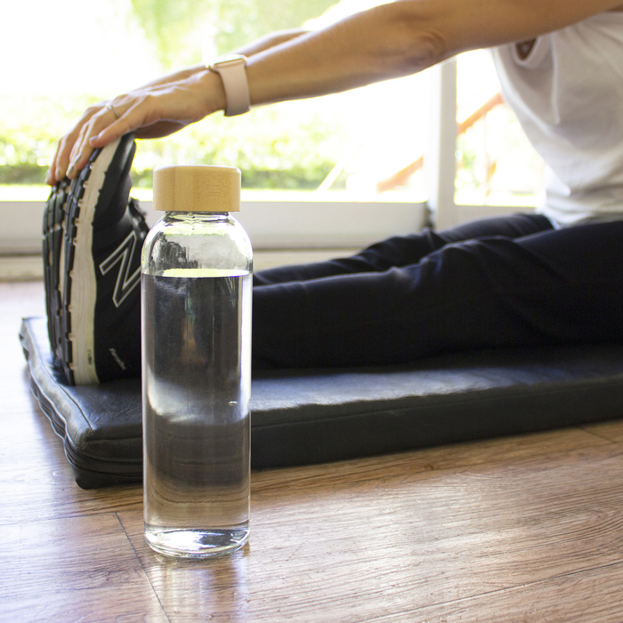 Ø 6,2 x 23 cm. Capacidad 500 ml. Vidrio resistente. Cuerpo traslúcido con tapa a rosca de bambú. Botella apta para microondas y lavavajillas, la tapa no puede ser expuesta a estos electrodomésticos.Presentación en caja de regalo Kraft