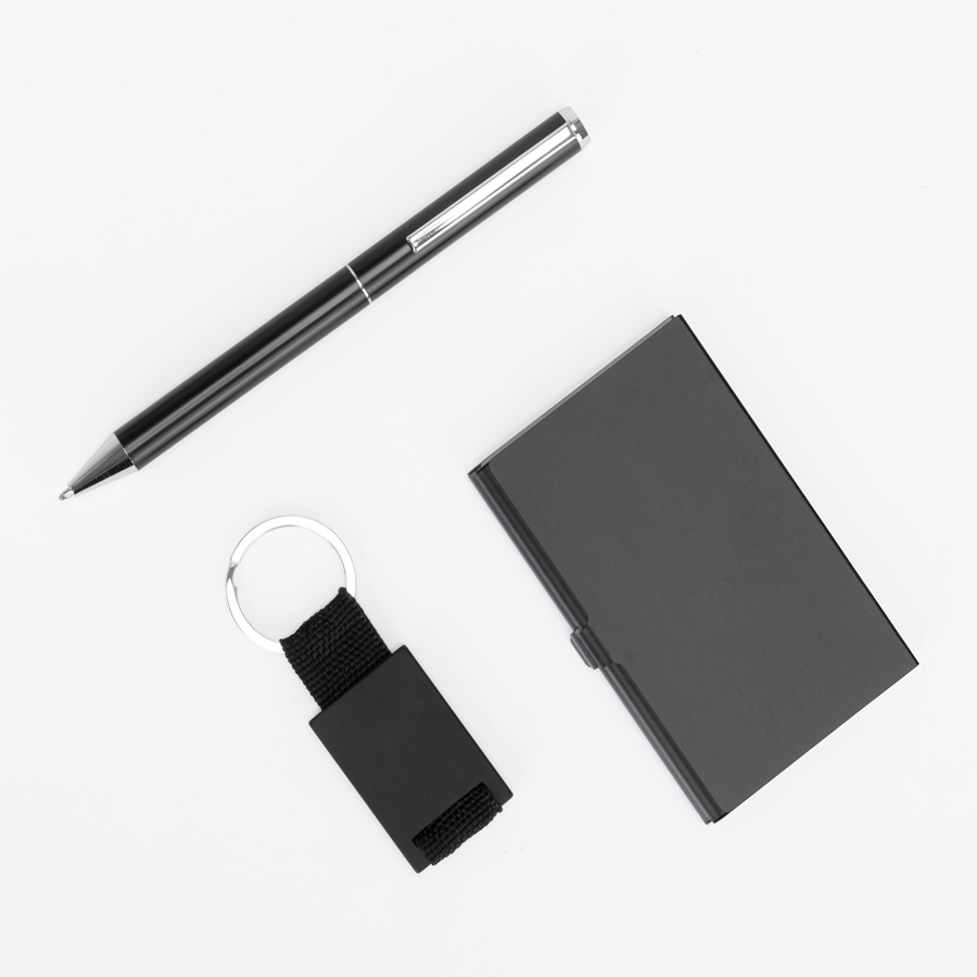 Set de Regalo ejecutivo «ARISTIDE», incluye llavero metálico negro con lanyard de poliéster negro + porta-tarjetas de Aluminio negro + Bolígrafo metálico negro con detalles color plata, escritura negra . Presentación en elegante caja de carton color negro con tapa, interior cuna de EVA aterciopelada negra. Sobre funda de papel negro.